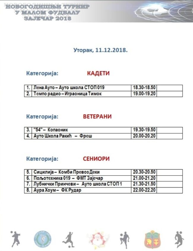Raspored utakmica za utorak 11. decembar Novogodišnji turnir "Zaječar 2019"By Nikola Pavlovic11.12.2018Leave a comment